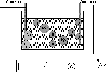 Cuando se realiza, por ejemplo, la electrólisis de una solución de sulfato cúprico (CuSO4) sucede lo siguiente